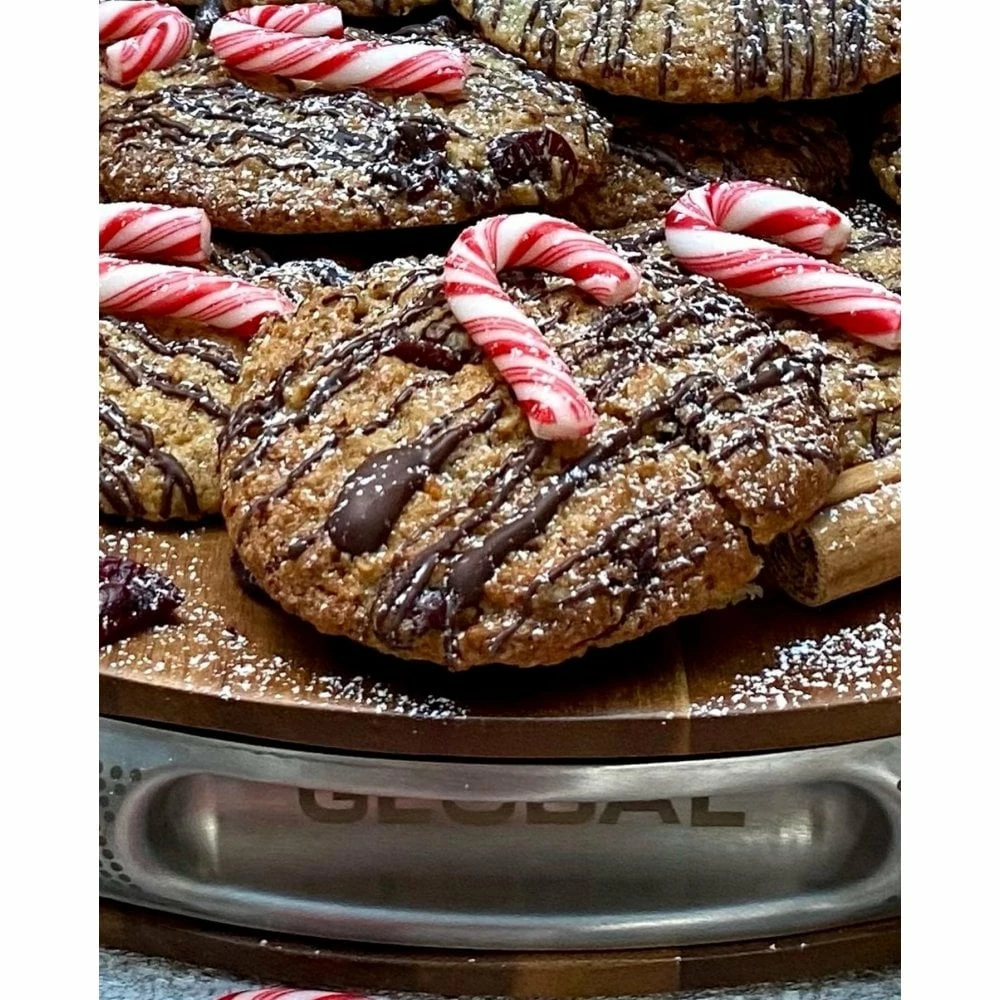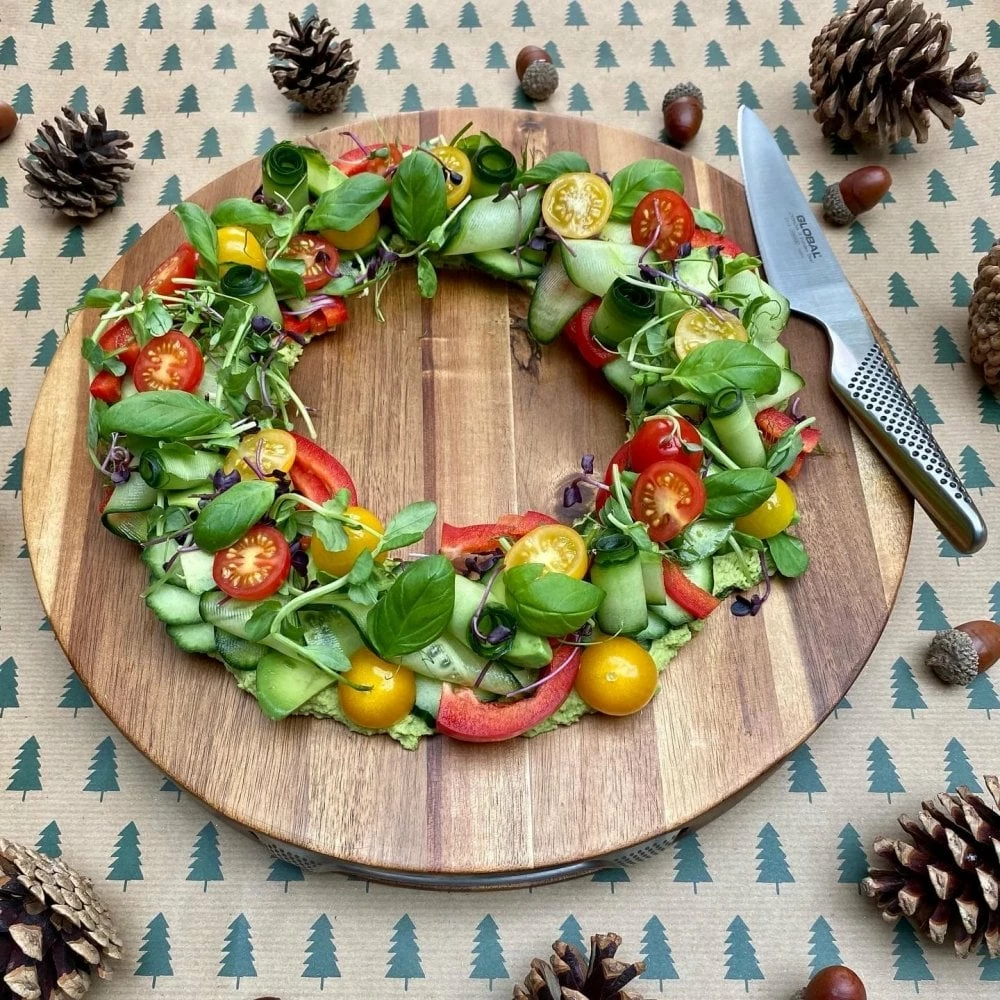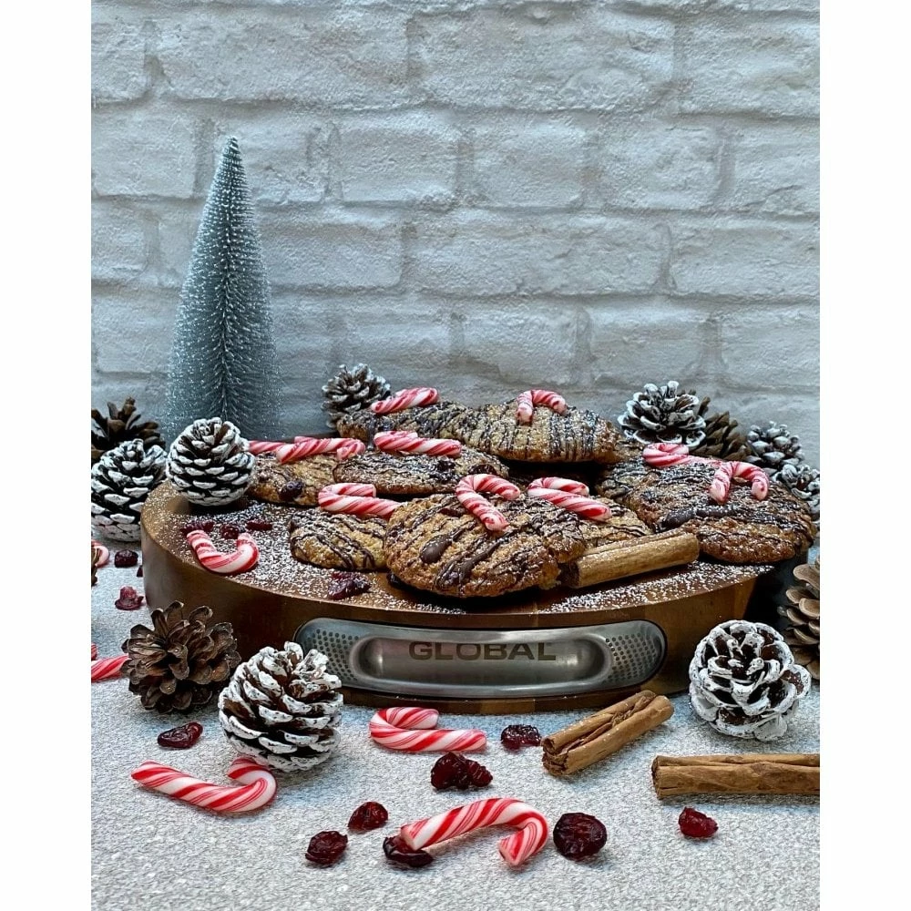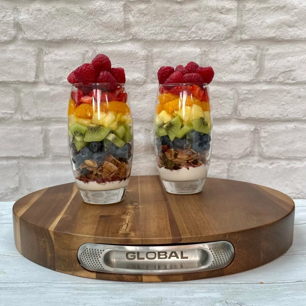 Made from beautiful acacia wood, this chopping board from Global is naturally anti-bacterial and ideal for preparing and serving food. Acacia is a highly durable and water-resistant hardwood that’s also resistant to scratching and warping. Its natural grain lends your kitchen countertop or table a warm, rich look. The board has 18/10 stainless steel moulded handle side panels with the distinctive Global branding of black dots. The craftsmanship is fully guaranteed against defects. Dimensions : 35 DIA x 4.5 cm.