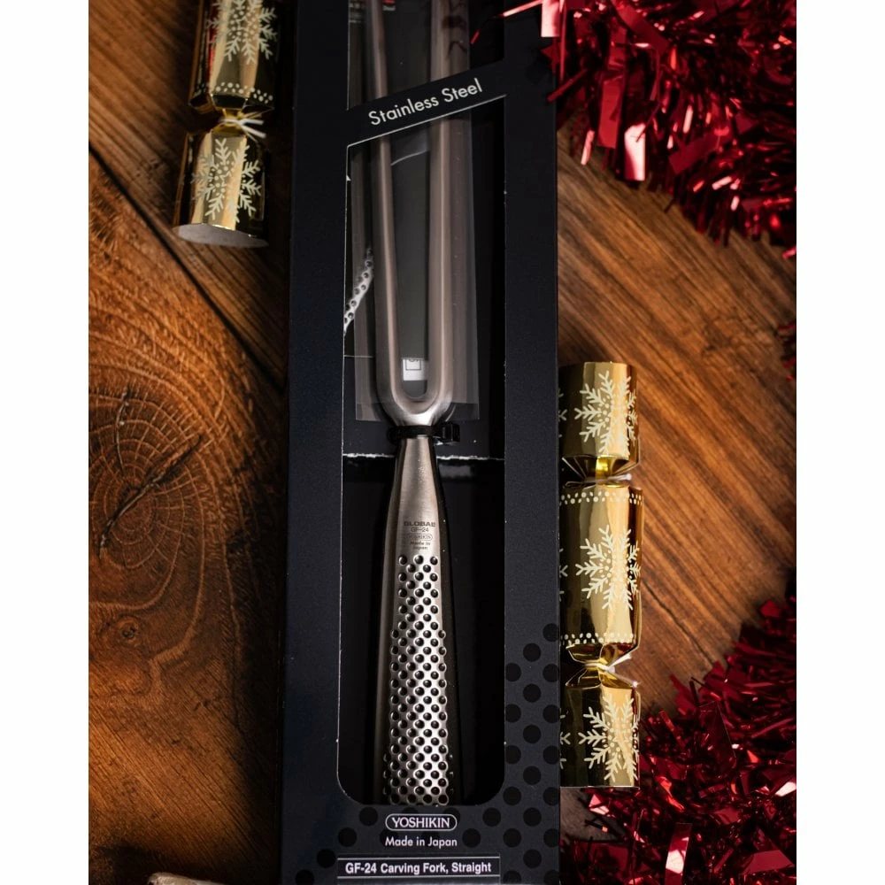 Global provide two carving forks in their range, the GF-24 and the G-13. Aesthetically the GF-24 is quite pleasing to look at. Smooth rounded lines finishing in two sharp points. I have always preferred the GF-24 to the standard G-13 carving fork. The main advantage of the GF-24 is that it fits in a drawer more easily as it lies flat! The G-13 prongs stick up meaning it often catches the roof of the drawer.