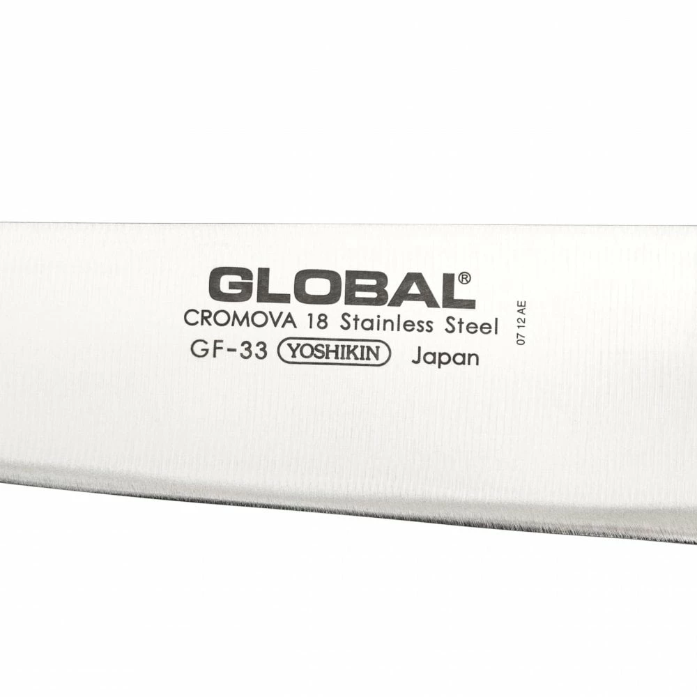 The Global GF-33, GF-34 and GF-35 are Global’s fully forged chef’s knives. As chef’s knives they can perform any kitchen task. They can slice dice and chop and are generally all round multi-purpose knives. The GF series of chefs knives come in three sizes, a GF 33 is 21cm, GF 34 27cm and GF 35 30cm and the vegetable chopper GF 36 is 20cm