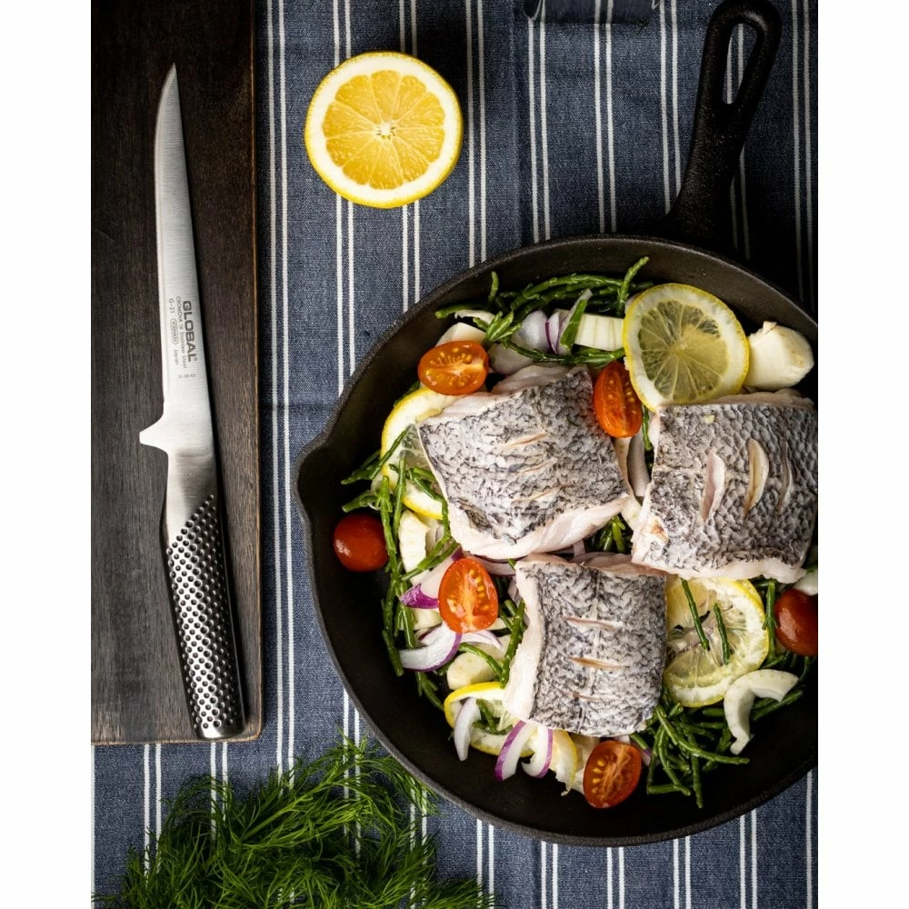 The G-21 is a classically shaped boning knife and is considered to be the standard boning knife in the Global series, it is certainly the best selling Boning knife.. The knife has a long narrow blade with is tapered to a very fine point. This allows the user to work round the bones in joints of beef, lamp or pork and cut out a sizable piece of meat. The blade is also flexible, which is great for getting under the skin and filleting fish. There are quite a few boning and filleting knives in the Global range, but the G-21 has a bolster, this is useful where working with raw meat or fish can make the knife slippy, it helps to prevent any unfortunate accidents. There is also a fully forged version of the knife, the GF-31.