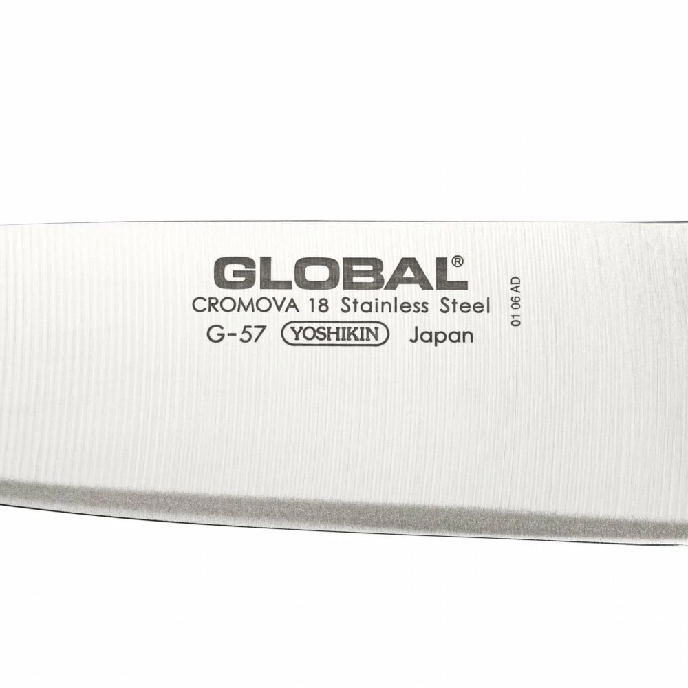 The G-57 is a chef’s knife and like the standard Global chef’s knives can perform most roles in kitchen. The G-57 is set apart from the other chef’s knives by its deeper blade. So the knife is more predisposed towards chopping vegetables. If you just needed one knife for the kitchen, but that vast majority of what you are doing is cutting vegetables, we would recommend this blade. It is quite similar to a Santoku knife, in fact it’s halfway between a classic chef’s knife shape and a santoku. Having actually laid the G-46 Santoku knife next to this blade, the difference between the knives is minimal, the difference being the slight absence of a Santoku’s lambs foot ending. So this knife could also be described as a 16cm Santoku knife.