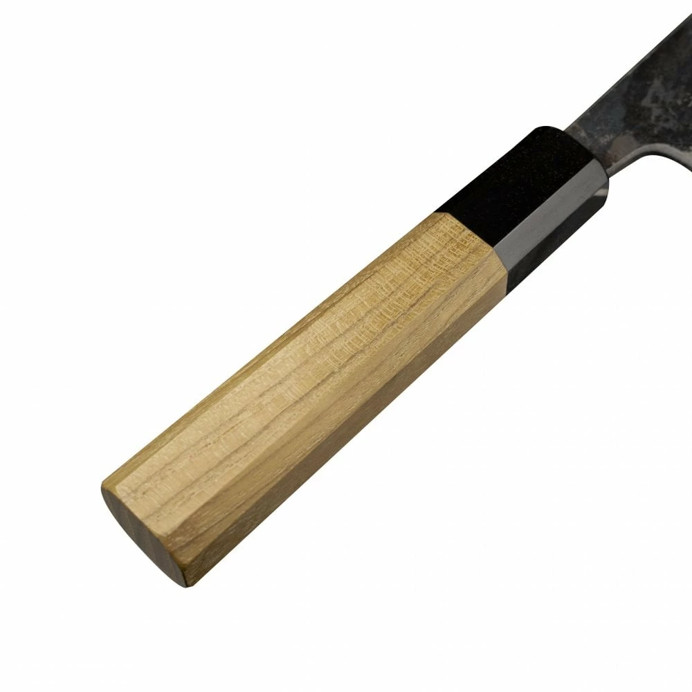 Absolutely Gorgeous! That’s how we would describe the Hatsukokoro Kumakage Blue 2 with Kurouchi and Damascus finish knives. When being unboxed, you can really see where the range gets its name from “Cloud Shadow “. Looking at the blade the soft Iron cladding with the Kurouchi finish is then hand sharpened to show a beautifully polished Damascus finish under the Iron cladding to then expose the Blue 2 steel core. When looking intently at the blade the contrast of the Iron cladding against the Damascus and Blue 2 steel edge almost looks as if you are looking up at a cloudy sky which is broken by patches of dark and light clouds. Having the core of Blue 2 steel it should be known that whilst this is one of the most premium quality steel cores available on the market but there is a high carbon content which makes them reactive. A little bit of TLC is all that is required with a few drops of camellia oil to keep the reactive blade in a protective coating. The edge gives an HRC of 62-63 and the handle is octagonal in teak with a black buffalo horn bolster.