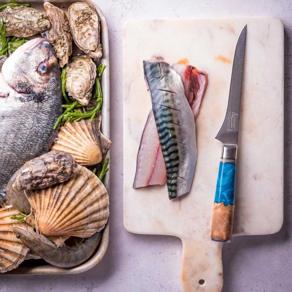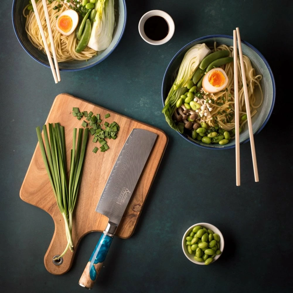 The Katana Elements 9 Piece Knife Block Ocean features a 20cm Chef’s Knife, 20cm Bread Knife, 20cm Carving Knife, 18cm Nakiri Knife, 15cm Boning Knife, 12cm Santoku Knife, 12cm Utility Knife and 9cm Paring Knife. These knifes are perfect for use within an industrial kitchen but will also look absolutely fabulous in your home. All the strength and sharpness of Japanese Damascus steel knives at an affordable price!