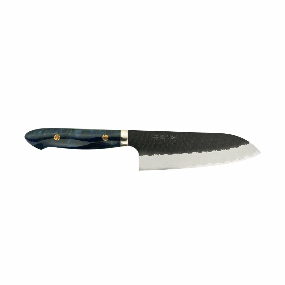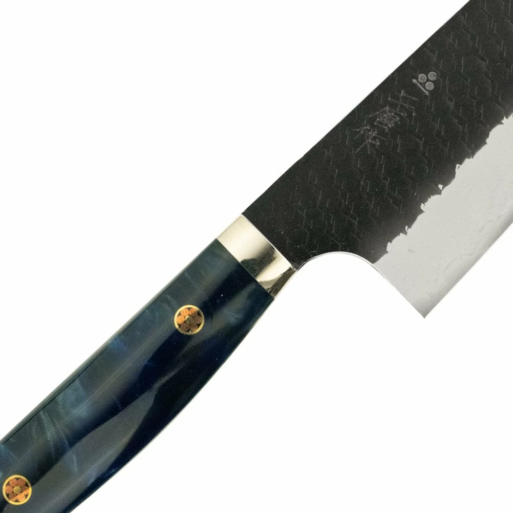 The 18cm long blade of the Santoku Knife is perfect for Vegetables, Meat and various Jobs around the kitchen. Nigara Hamono is a living legend within Japanese Knifemaking circles, originally from a Samurai sword-making clan, the Niagara Hamono bloodline can be traced back about 400 years or 8 generations to be exact. Having been a legendary swordsmith the skills have been transferred across the years and now you can find all that experience within the knives Nigara Hamono forges. The knives come in beautiful grey presentation boxes with silver foil embroidered brand logo’s. The blade has an SG2 core, which is clad in stainless steel giving it longevity in terms of performance but balances edge retention and durability. The handle is a beautiful custom western shape, It is a full tang blade with a blue resin handle held in place by two mosaic pins. The blade is finished in a beautiful Kurouchi Tsuchime finish which is hand-hammered to create a unique pattern on every piece making them essentially a piece of artwork with an exquisite cutting edge that is subtly visible under the stainless steel cladding.