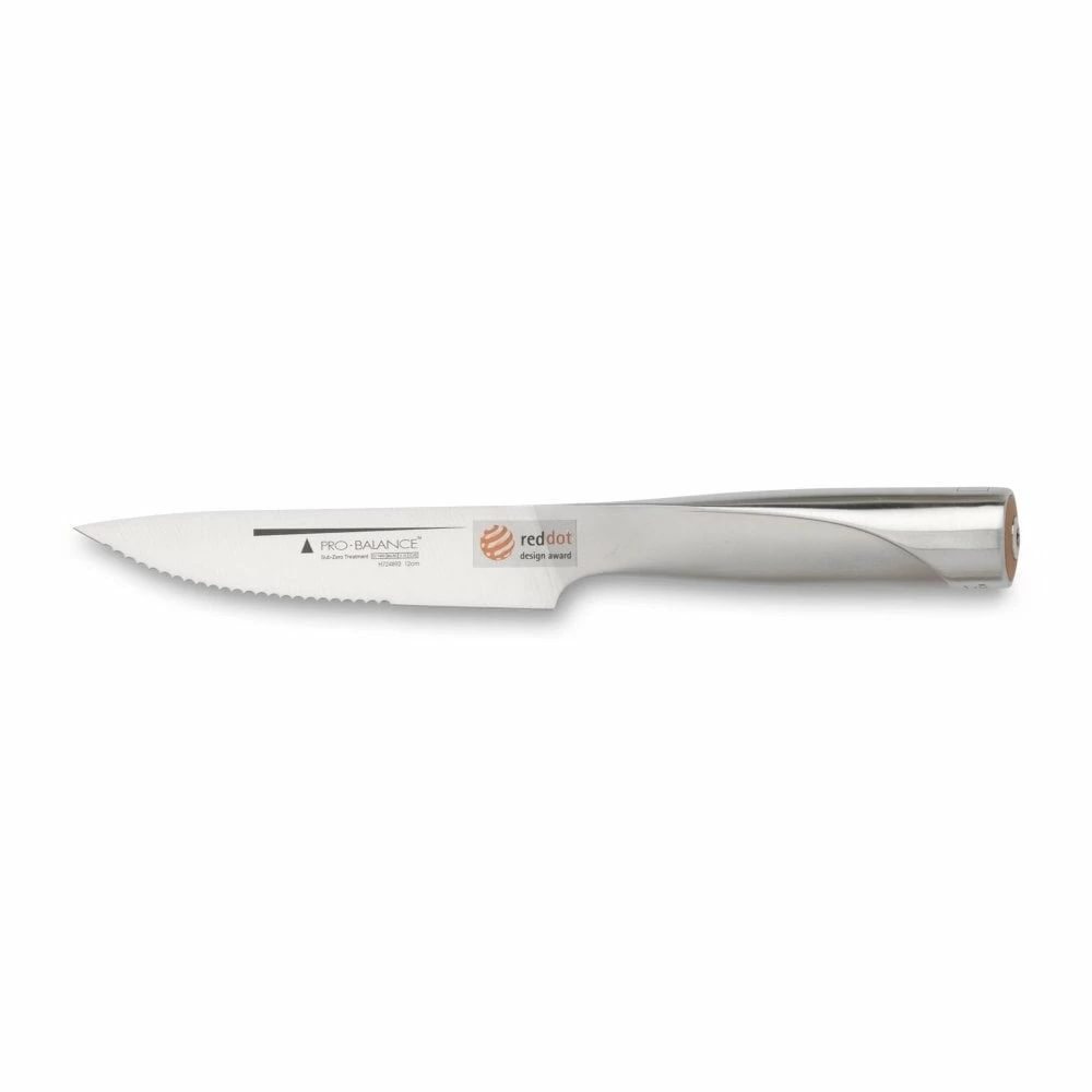 Pro Balance Knives are revolutionary in concept and design. All Pro Balance Knives feature a hollow handle which can be opened to customise the weight by adding or removing small weights. If you like the sharpness of a true Japanese knife, but hate the weight of most Japanese knives, simply add in the included weights into the handle. By shifting the weights forwards or backwards you can alter the centre of balance of the knife which will either aid a pinch or hammer grip. The knife itself is no gimmick though and has an all S/S design and structure. The blade undergoes sub-zero treatment during the tempering stage to create an incredibly strong blade (made from German 1.4116 steel) with a +55 HRC rating, and hand sharpened to rival any Japanese brand. The knives slice through food effortlessly and all come with a special coloured end cap so you can tell which knife is which in the block. Always wash your knives by hand; dry thoroughly and never put them in a dishwasher. Knives should be stored in a block or other protective case to protect the blades and always kept out of reach of children.