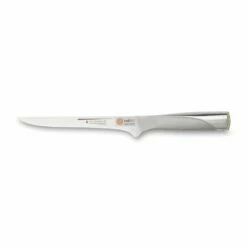 The boning knife is typically characterised with a very sharp point and narrow blade and primarily used in the preparation of meats such as poultry, seafood and beef. The Honesuki or boning knife features a distinctively Japanese style of a triangular shape that is very rigid compared to the Western-style boning knife.