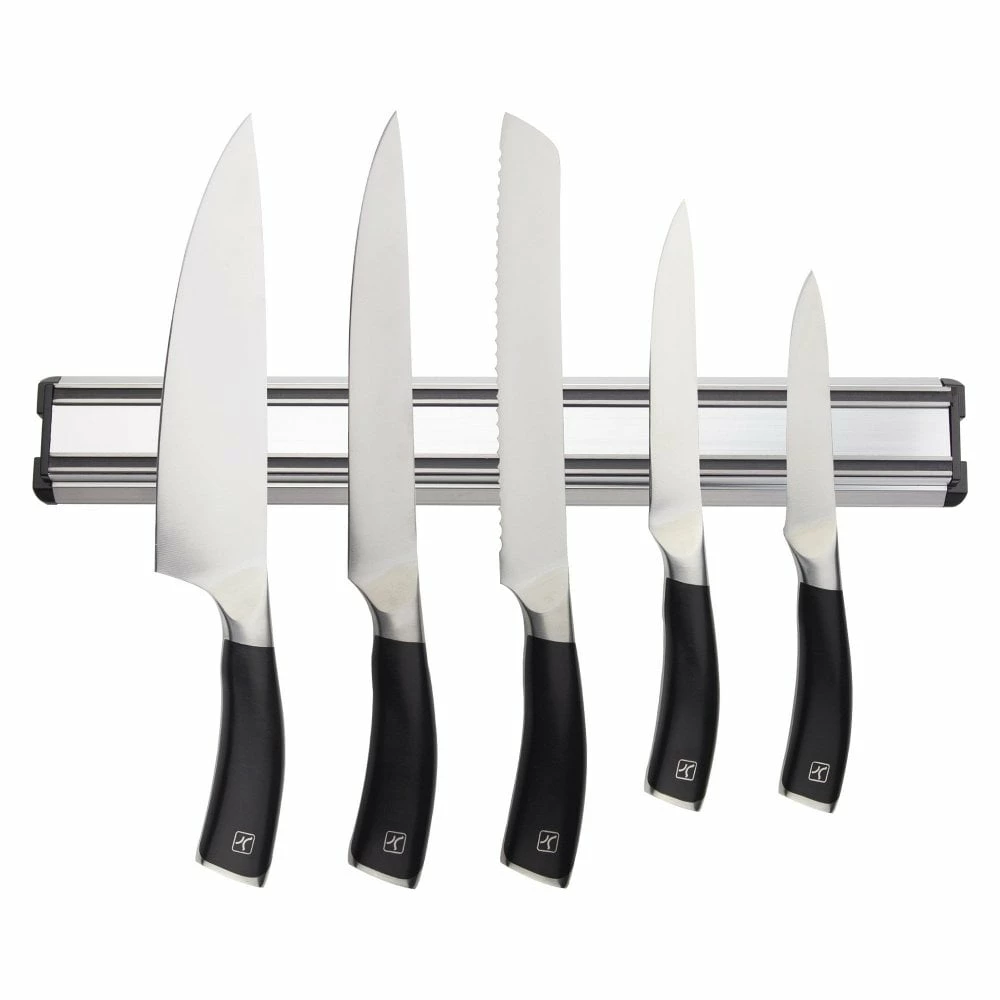 Lavish and practical, this knife rack allows the user easy access to their knives during food prep whilst having them on show. The set contains a kitchen Knife, Carving Knife, Bread Knife, Utility Knife & Paring Knife.