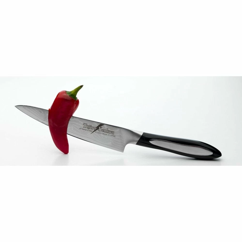 The Fujitora factory of Niigata Japan has produced what we consider to be the ultimate perfection in a blend of Japanese and European knife design. Tojiro Senkou DP (Flash) knives, meaning Flash in English are insanely sharp. These knives are made out of the finest Damascus steel wrapped around a VG-10 core to provide a very hard cutting edge (Rockwell 60-62). The handles are made from Micarta material with a steel inlay in a shape which is very comfortable to use. There is also a special die cast bolster welded onto the handle of the knives, which provides a smooth touch and comfortable grip. The overall knife is as sharp as you could possibly imagine, but it has the weight and presence of a European knife. In our opinion these are as good as it gets. Tojiro Senkou DP (Flash) knives are used and endorsed by Heston Blumenthal, one of the world’s very few 3* Michellin chefs and are used by him and his staff in the kitchen of the Fat Duck restaurant.