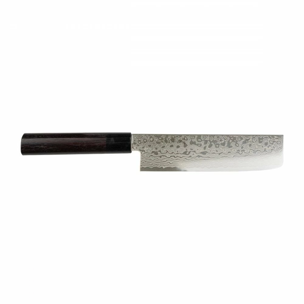 To start with the ZA-18 steel is user friendly and has rust-resistant properties that make it easy to care for. The Alloy composition of ZA-18 is made up of cobalt, molybdenum, chromium with a carbon content that is slightly higher than the level found in VG-10, giving the blade a higher resistance to corrosion and a touch more strength and durability. VG-10 is the steel of choice for most of the blacksmiths that make up the Takefu Knife Village. The steel is tempered to give a hardness of around 61-62HRC. The ZA-18 Damascus Santoku is a superb, versatile kitchen knife with great balance, incredible sharpness, resistance to rust, easy to maintain and to sharpen, with a beautiful 63-layered Damascus patterning. The handles are a beautiful Rosewood asymmetrical D-Shape. The ZA-18 Damascus Nakiri is made by the leading blacksmith of Yoshida Hamono, Osamu-San. The Nakiri is a Japanese style vegetable knife. It has a really straight blade so that you can cut down to the board without having to make a horizontal slicing action. This knife is perfect for cutting up vegetables.