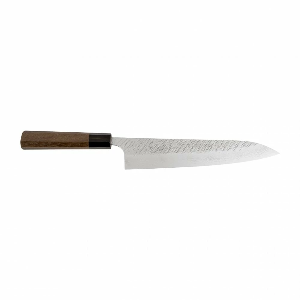 The 21cm long blade of the Gyuto Knife comes with an octagonal walnut handle and is the perfect go-to knife for all kitchen tasks, essentially a medium chef’s knife. Yu Kurosaki presents his Fujin range of knives, made from VG-10 stainless steel and finished with a Hammered & Damascus finish on the blade of the knife. Fujin meaning “Wind God” is the name given to the knife for the distinctive hammered pattern finish on the blade which represents the wind. Along with this, it is finished with a beautiful Damascus pattern on the blade as well making it glisten in the light. Fujin has a traditional Japanese knife construction with an Octagonal handle made from walnut, these are top of the line knives made for serious knife enthusiasts. Yu Kurosaki’s patterns on the blade are distinctive and well recognised, Kurosaki being one of the leading blacksmiths of the Takefu Knife Village. By using centuries-old forging techniques, he manages to create blades that have immensely sharp cutting edges that will stand the test of any chef. – a beautifully efficient handmade knife.